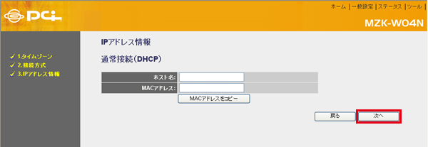 そのときは、「ホスト名」に任意の名前を入力し、プロバイダに登録してあるMACアドレスを入力して、 [次へ]をクリックします。