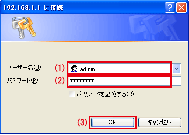 (1)「ユーザ名」に「admin」を半角文字で入力します。