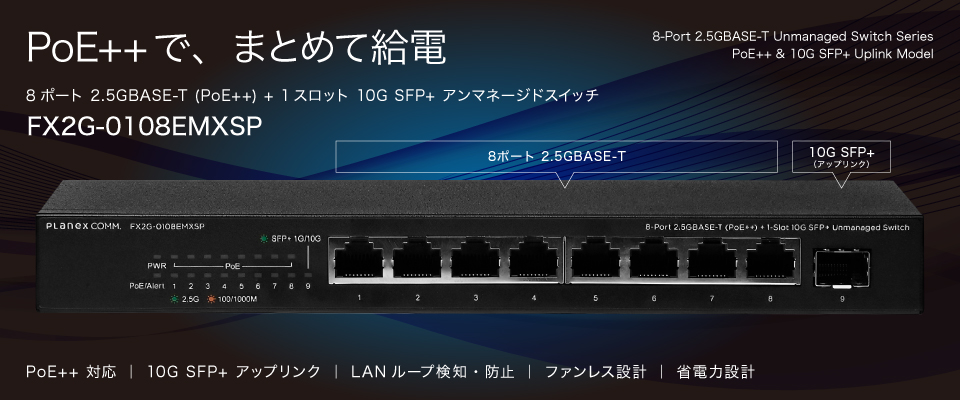 全ポート2.5GBASE-T(PoE++)と1スロット10G SFP+対応アンマネージドスイッチ「FX2G-0108EMXSP」新発売