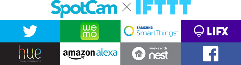 SpotCamクラウドサービスはIFTTTサービスに対応しているため、Amazon Alexaのデバイス、FacebookやTwitterなど様々なサービスと連携し自動化することができます。