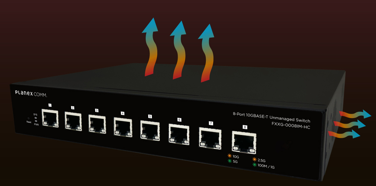 プラネックスコミュニケーションズ株式会社は、放熱性能を強化した高冷却設計を採用し、高温環境下でも安定した動作を維持する全ポート10GBASE-T対応の8ポートアンマネージドスイッチ「FXXG-0008IM-HC」を発売します。