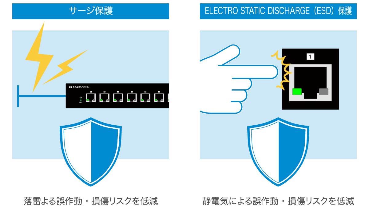 サージ保護(6kV)に加え、静電気放電(ESD:接触8kV/気中15kV)への高い耐性を備えています。これにより、落雷や静電気による誤作動・損傷のリスクを大幅に低減します。外部ノイズの影響を受けやすいネットワーク機器の信頼性を強化し、産業機器や監視システムなど、安定性が求められる現場においても安心してご利用いただけます。
