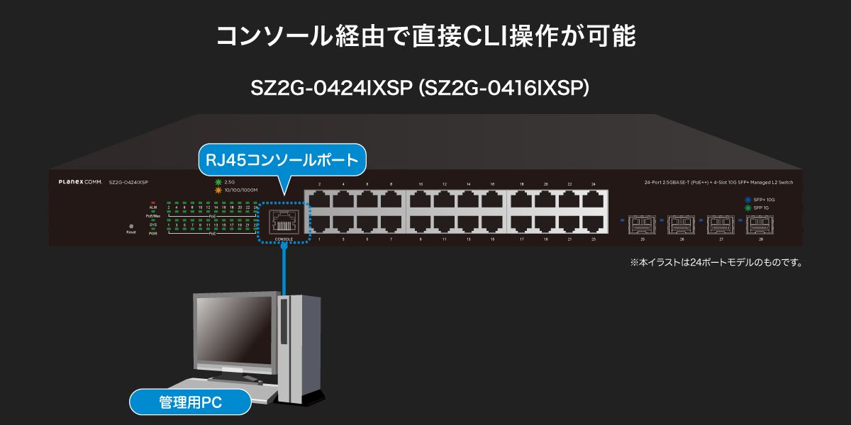 RJ45コンソールポートに加え、Telnet・SSH経由での標準的なCLI操作に対応しています。