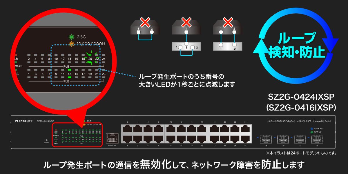 LAN内で誤接続などによって発生したループを自動的に検知し、該当ポートを遮断することでネットワーク全体の通信障害を未然に防ぎます。