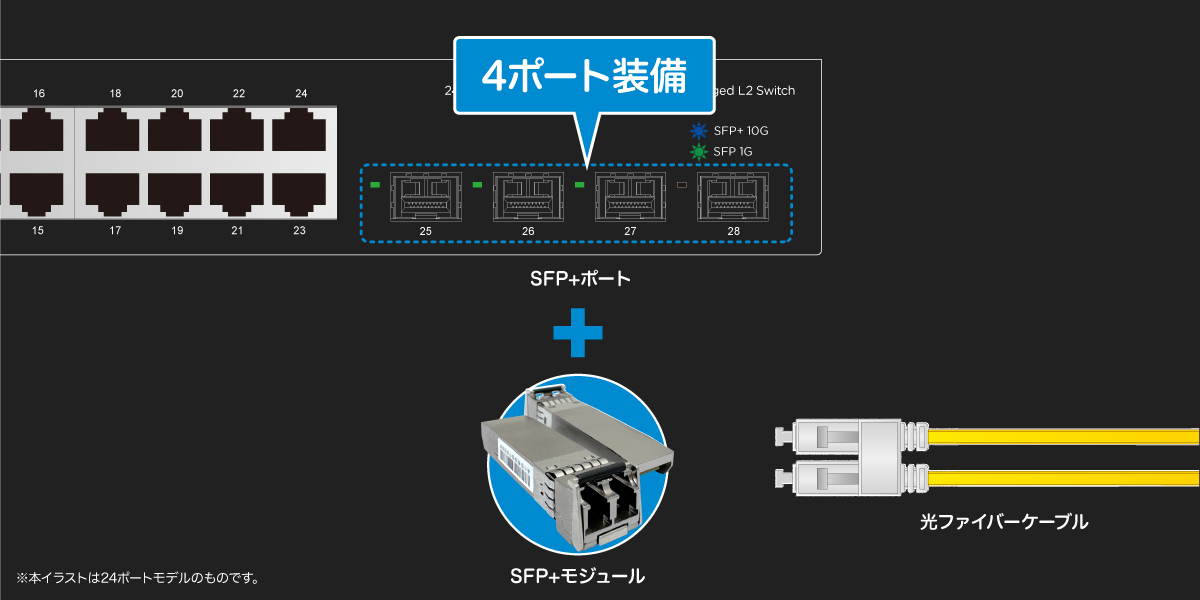 光ファイバー接続に対応する10G SFP+スロットを4基搭載しており、上位スイッチやサーバーとの高速なバックボーン接続を実現します。