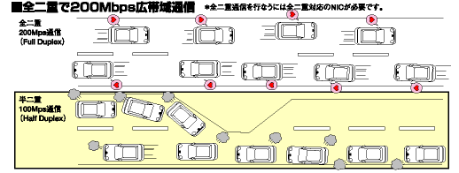 一般のハブではあるポートへデータを送っている最中、他のポートは常に待たされている状態になります。ネットワークに繋がっているマシンの台数が少ない場合では時間が経てば自分の順番が回ってきますが、台数が増えてくるといつまで経っても自分の順番が回ってこなくなります。そこでスイッチングハブと全二重(Full Duplex)対応のネットワークアダプタを接続すると送信と受信の同時通信ができますので、効率よくデータの送受信ができるようになります