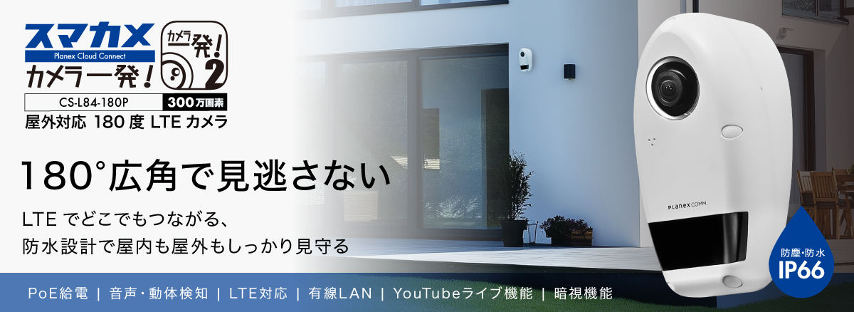 | 同梱物 | CS-L84-180P(本製品)、ACアダプター、LANケーブル、ブラケット、ブラケット用ネジ、カメラ本体用ゴムキャップ、壁面取り付け用ネジセット、LANケーブル用防水カバーセット、六角棒レンチ、SIMカードトレイ、SIM取り出し用ピン、印刷物(カンタンガイド、保証書等) |