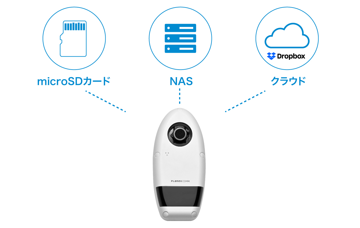 | 画像送出機能 | 動画:クラウド録画(Dropbox) NAS録画(SMB v1~3)、microSDメモリーカード 静止画:Eメール、FTP、NAS録画(SMB v1~3)、microSDメモリーカード |