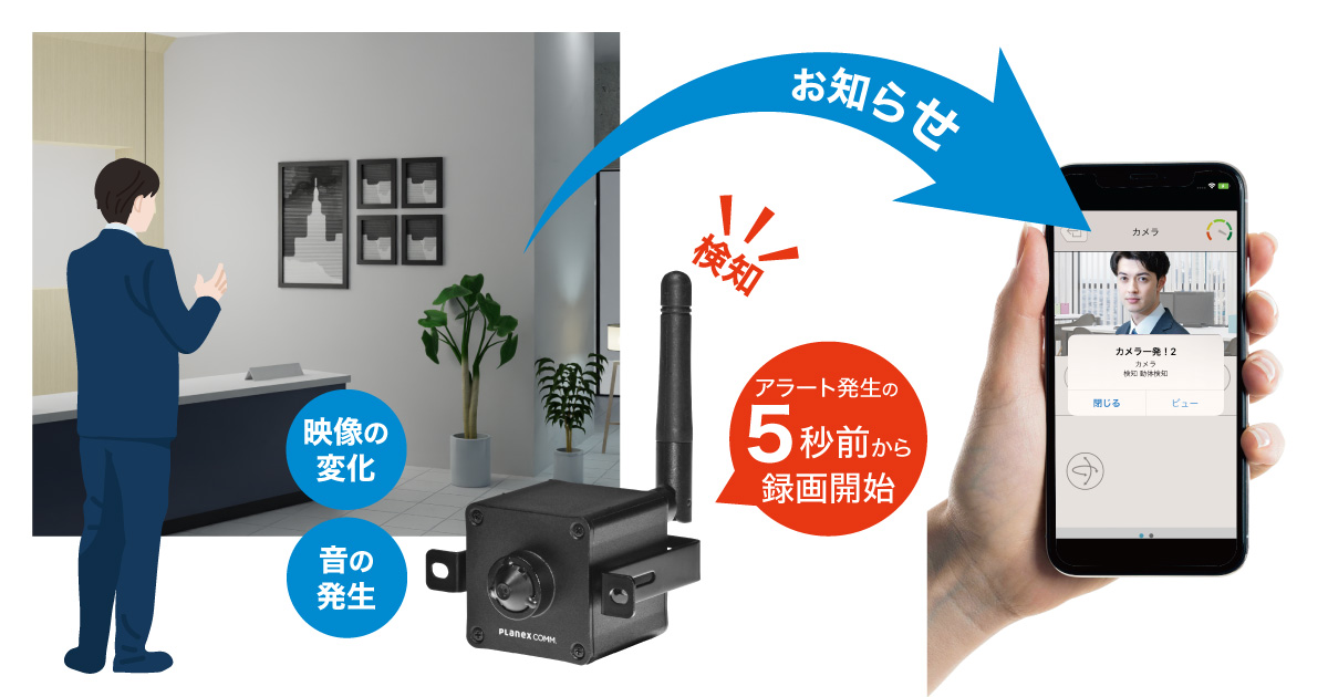 アラート発生の約5秒前から録画が開始されるため、検知直前の様子まで確認可能です。