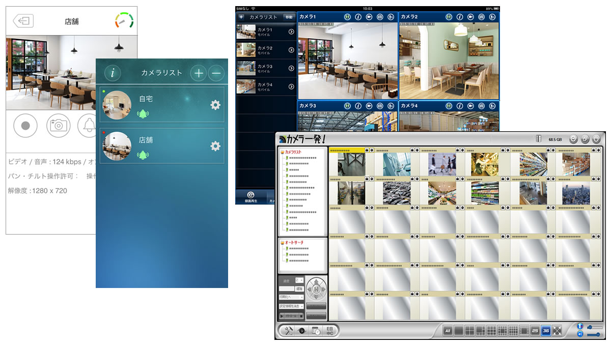 iPad対応アプリでは最大6台、Windowsパソコン対応アプリでは最大36台のカメラ映像を一画面で同時に表示できます。