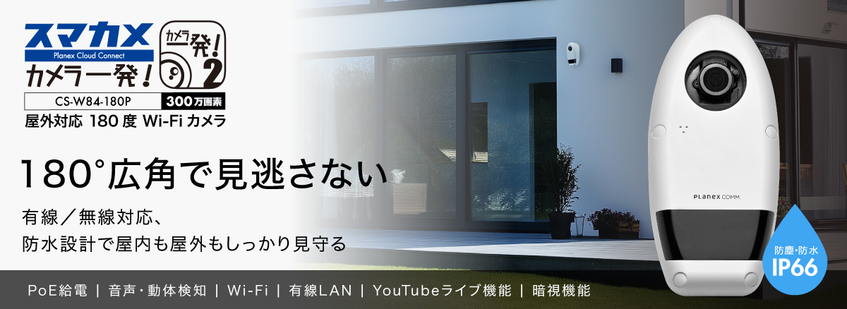 | 同梱物 | CS-W84-180P(本製品)、ACアダプター、LANケーブル、ブラケット、ブラケット用ネジ、カメラ本体用ゴムキャップ、壁面取り付け用ネジセット、LANケーブル用防水カバーセット、六角棒レンチ、印刷物(カンタンガイド、保証書等) |