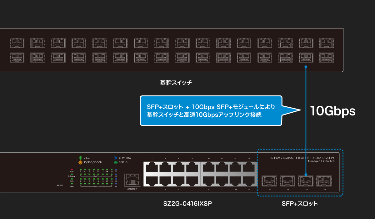 「SZ2G-0416IXSP」は、全ポート2.5GBASE-T対応・4スロット10G SFP+搭載のPoE++対応マネージドL2スイッチです。