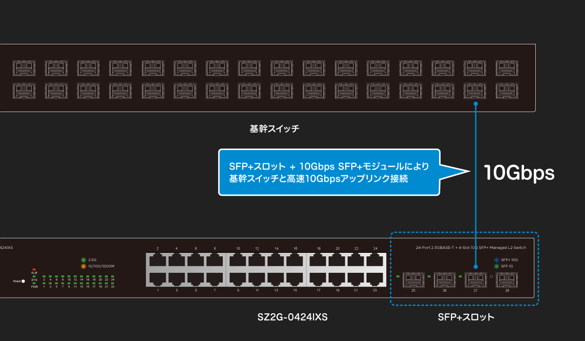 「SZ2G-0424IXS」は、全ポート2.5GBASE-T対応・4スロット10G SFP+搭載のマネージドL2スイッチです。