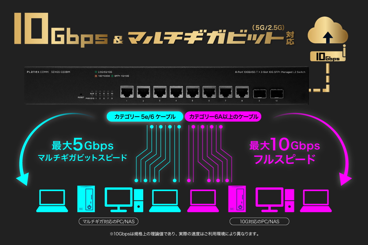 100Mbps(全二重) 1000Mbps(全二重) 2.5Gbps(全二重) 5Gbps(全二重) 10Gbps(全二重) ※オートネゴシエーション、Auto MDI/MDI-X対応 |