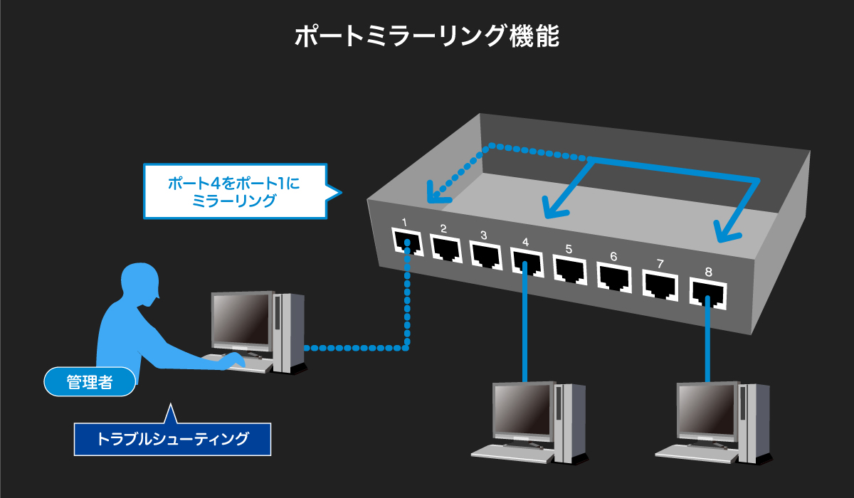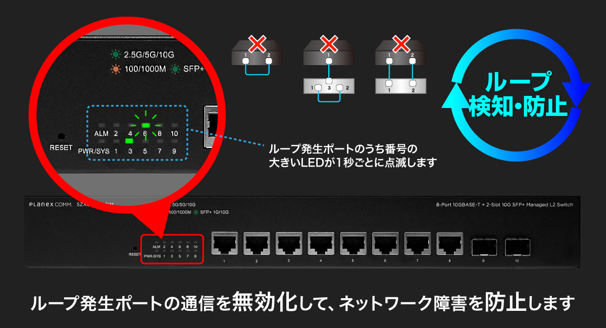 | ループ検知/防止 | 対応 ※Loop Detection Frameによる検出 ※有効/無効設定可(初期値無効) |