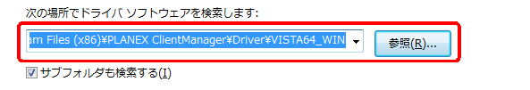 [参照]ボタンをクリックし、「ローカルディスク(C:)」−「Program Files」−「PLANEX ClientManager」−「Driver」−「WIN7_WIN」のフォルダをクリックします。