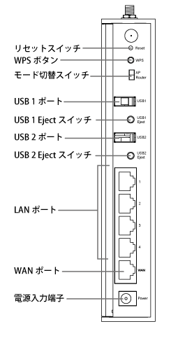 WPS(無線LAN簡単設定機能)を使うとき、このボタンを2 秒程度押して離します。(WPS ランプが緑色に点灯します)
