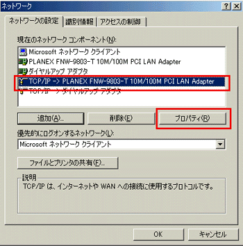 「現在のネットワークコンポーネント」から「TCP/IP → お使いのLANカード(またはLANボード)」を選択し、[プロパティ]をクリックします。
