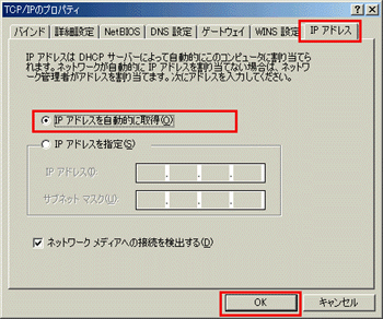 「IPアドレス」タブの「IPアドレスを自動的に取得」がチェックされていることを確認し[OK]をクリックします。