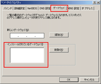 「ゲートウェイ」タブをクリックし、「インストールされているゲートウェイ」欄に何も設定されてないことを確認します。