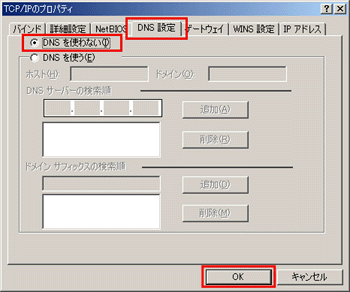 「DNS設定」タブをクリックし、「DNSを使わない」をチェックします。[OK]をクリックします。
