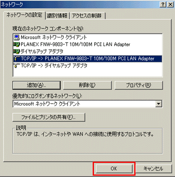 ここでは、LANカードに「PLANEX FNW-9803-T 10M/100M PCI LAN Adapter」を使用しています。 |
