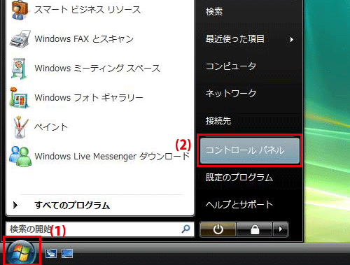 「スタート」ボタンをクリックし、「コントロールパネル」をクリックします。 ▼「コントロールパネル」が表示されます。