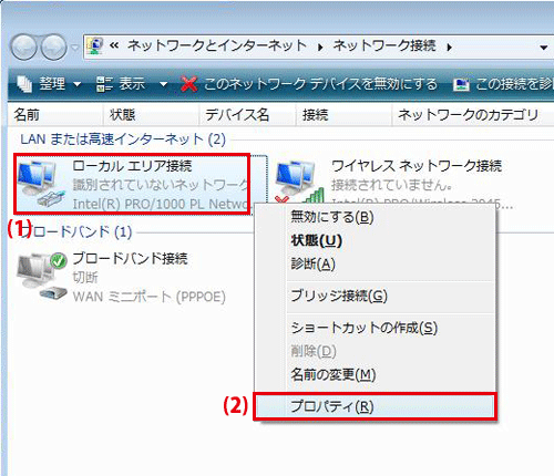 ローカルエリア接続を右クリックして「プロパティ」を選択します。 ▼「ユーザーアカウント制御」が表示されます。