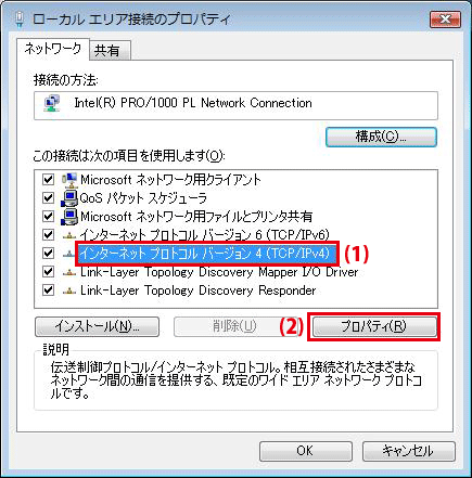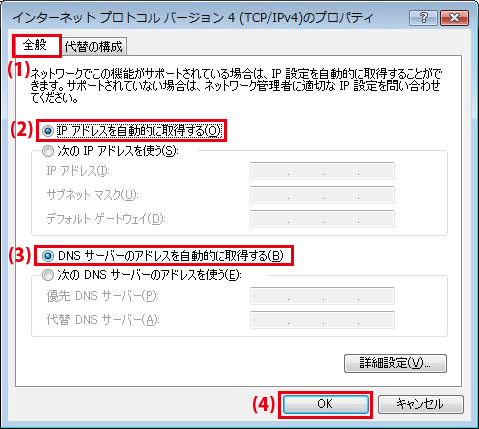 (1)「全般」をクリックします。 (2)「IPアドレスを自動的に取得する」を選びます。 (3)「DNSサーバーのアドレスを自動的に取得する」を選びます。 (4)[OK]をクリックします。 ▼「ローカルエリア接続のプロパティ」に戻ります。