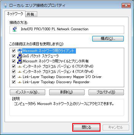 [続行]をクリックします。 ▼「ローカルエリア接続のプロパティ」が表示されます。