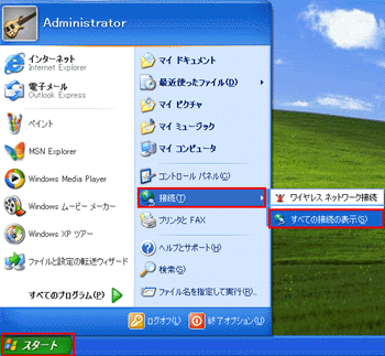 「スタート」→「接続」→「すべての接続の表示」をクリックします。