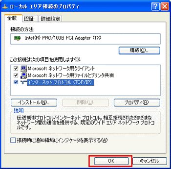 「ローカルエリア接続のプロパティ」に戻ります。[OK]をクリックし画面を閉じます。