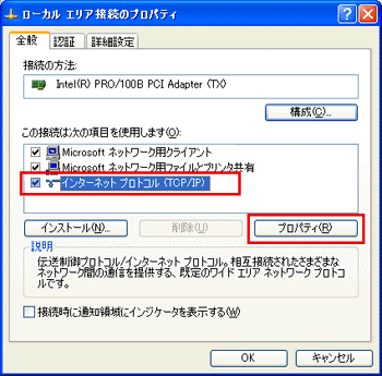 「ローカルエリア接続のプロパティ」が表示されます。「インターネットプロトコル(TCP/IP)」をクリックし、[プロパティ]をクリックします。