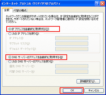 「インターネットプロトコル(TCP/IP)のプロパティ」が表示されます。 「IPアドレスを自動的に取得する」と「DNSサーバのアドレスを自動的に取得する」がチェックされていることを確認し[OK]をクリックします。