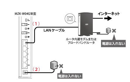 (1)ルータ内蔵モデムまたはブロードバンドルータ → (2)本製品の順に電源を入れます。