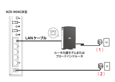 (1)本製品とルータ内蔵モデムまたはブロードバンドルータをLANケーブルで接続します。