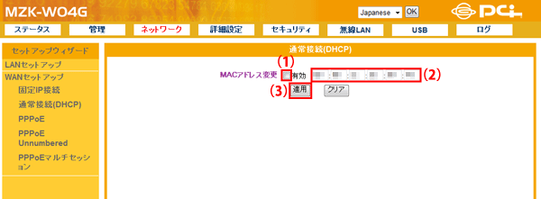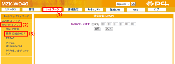 設定画面で「ネットワーク」−「WANセットアップ」−「通常接続(DHCP)」をクリックして、「通常接続(DHCP)」設定画面を表示させます。 ※設定画面の表示方法についてはこちらを参照してください。