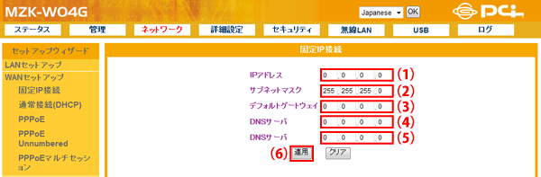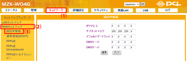 設定画面で「ネットワーク」−「WANセットアップ」−「固定IP接続」をクリックして、「固定IP接続」設定画面を表示させます。 ※設定画面の表示方法についてはこちらを参照してください。