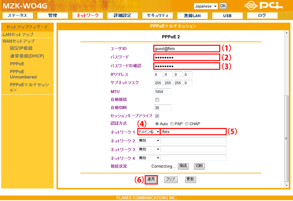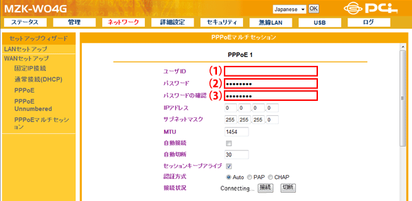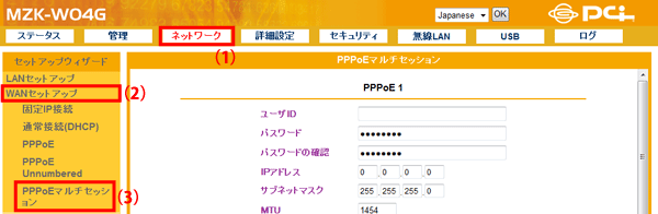 MTU値を設定します。初期設定は「1454」です。通常は初期設定のまま使用します。 |