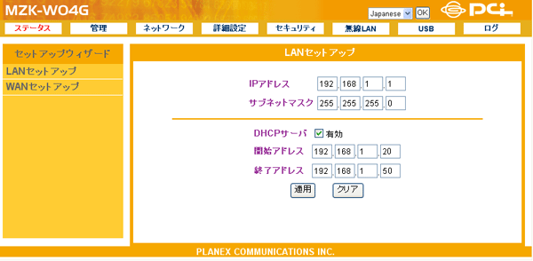 DHCPサーバ機能を有効にするとき、「有効」にチェックします。