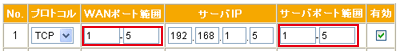 「WANポート範囲」、「サーバポート範囲」で複数のポートを範囲指定するときは、同じポート範囲を指定します。