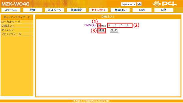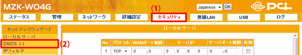 設定画面で「セキュリティ」−「DMZホスト」をクリックして、「DMZホスト」設定画面を表示させます。 ※設定画面の表示方法についてはこちらを参照してください。