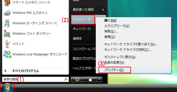 「スタート」から「コンピュータ」を右クリックし、「プロパティ」をクリックします。