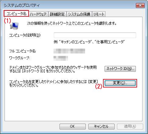(1)「コンピュータ名」タブをクリックします。