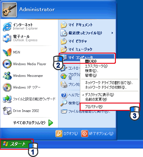 [スタート]メニューから[マイコンピュータ]を右クリックし、「プロパティ」をクリックします。
