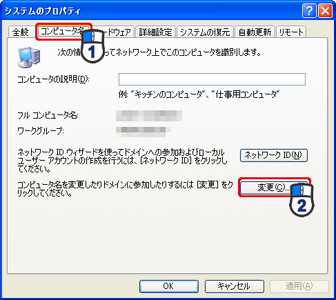 (1)「コンピュータ名」タブをクリックします。