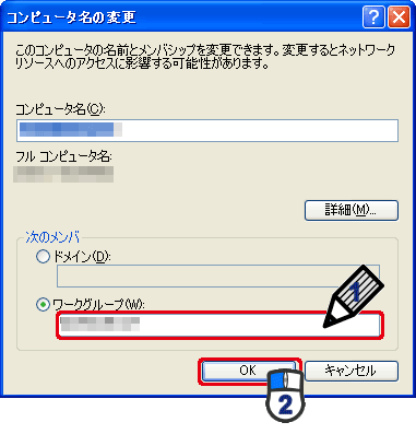 (1)「次のメンバ」から「ワークグループ」を選び、お客様が決めたワークグループ名を半角英数文字で入力します。