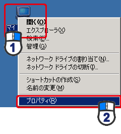 デスクトップ上の「マイコンピュータ」アイコンを右クリックし、「プロパティ」をクリックします。