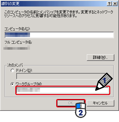 (1)「次のメンバ」から「ワークグループ」を選び、お客様が決めたワークグループ名を半角英数文字で入力します。