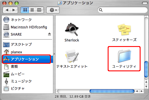 「アプリケーション」をクリックし、「ユーティリティ」フォルダを開きます。